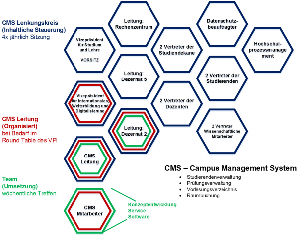 Das Team von CMS betreut das Studienportal technisch und entwickelt es weiter. Neben dem Vorlesungsverzeichnis enthalten das Studienportal und die angeschlossenen Systeme der Studierendenverwaltung und der Prüfungsverwaltung die komplette Abbildung des „Student-Life-Cycle“: von der Bewerbung über die Verwaltung, Prüfungsanmeldung bis zur Erstellung von (Abschluss-) Bescheinigungen. In allen Bereichen wird ein Customer-Support zur schnellen Behebung von individuellen Problemen angeboten. Größere Änderungen, wie z.B. die Konzeption, Absprache und technische Umsetzung von Prozessen oder neue Berichte und Bescheinigungen werden dagegen in länger laufenden Arbeitspaketen organisiert.