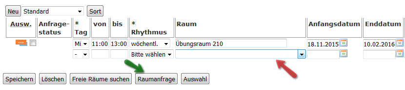 Zu verwalteten Räumen (z.B. fast alle großen Hörsäle) gibt es immer einen Raumverwalter. Hierzu müssen Sie den Termin auswählen (Checkbox) und den Button „Raumanfrage“ betätigen (grüner Pfeil).
